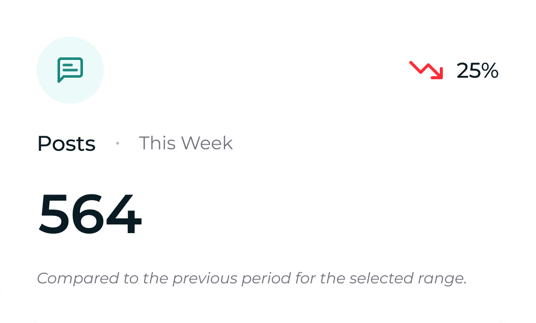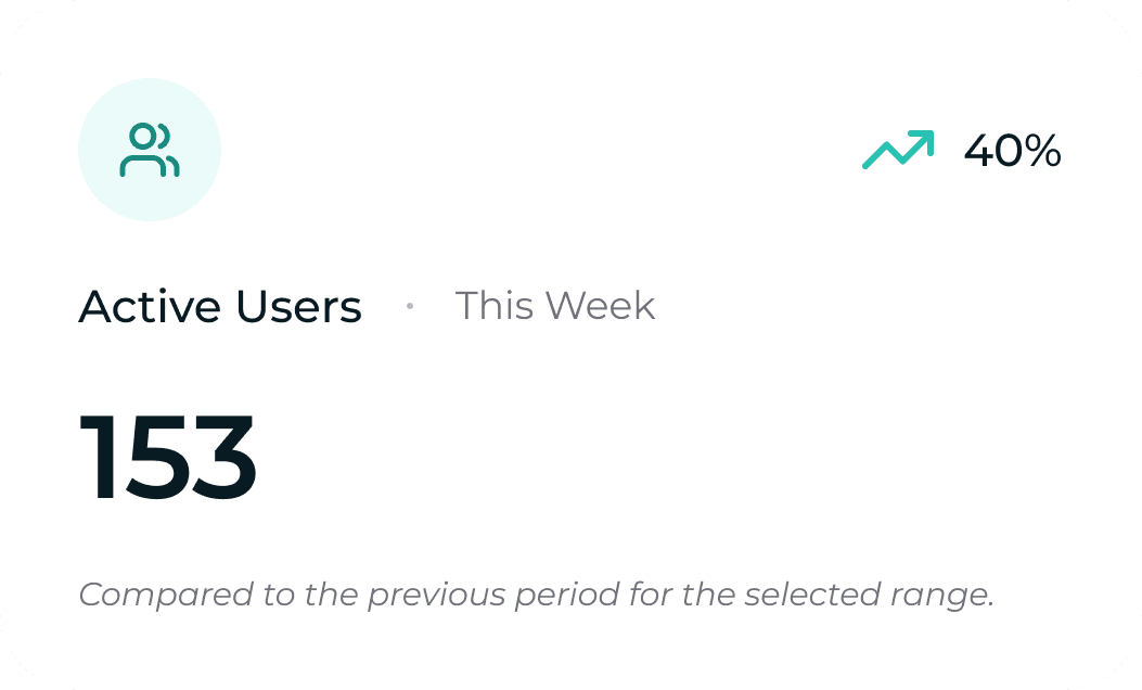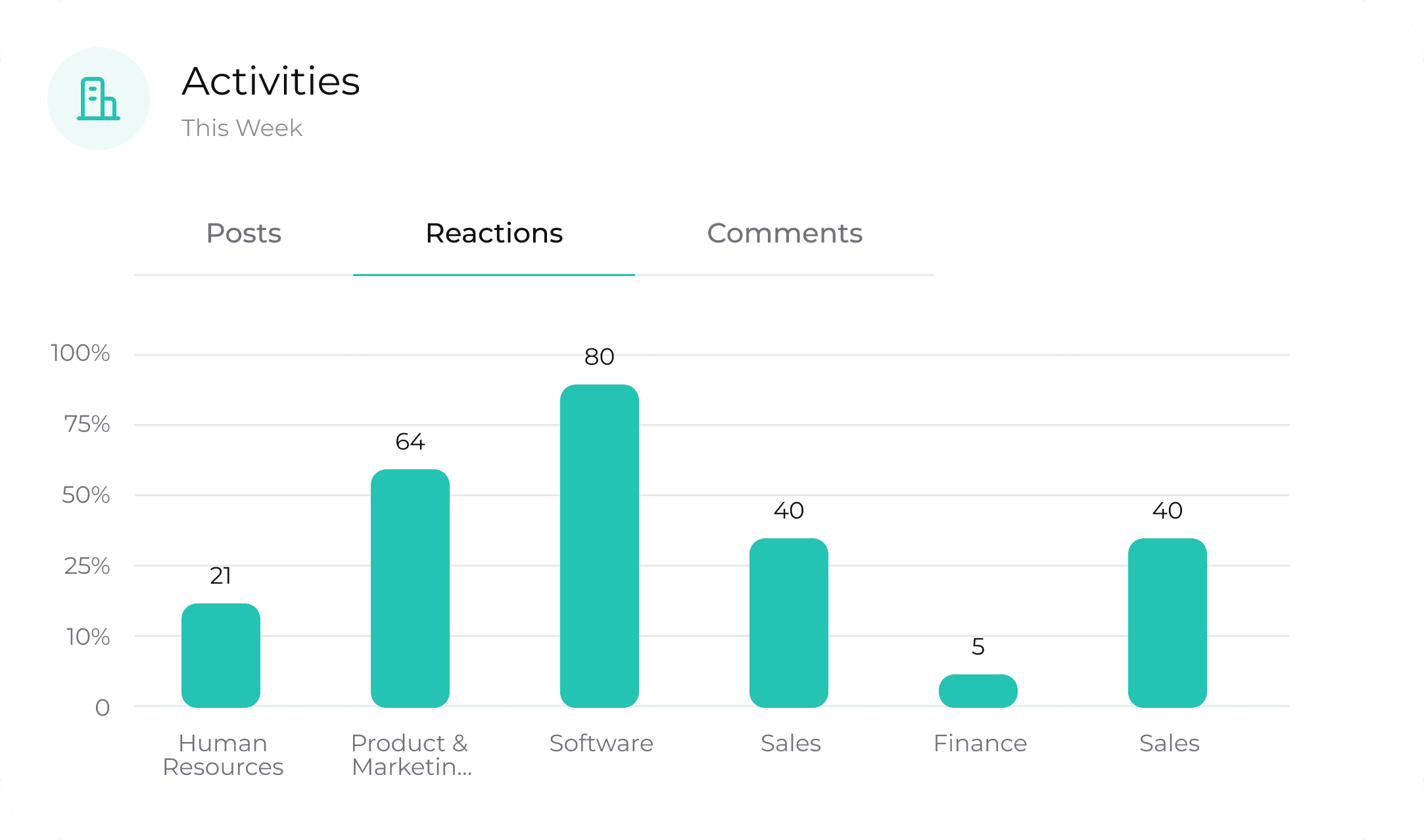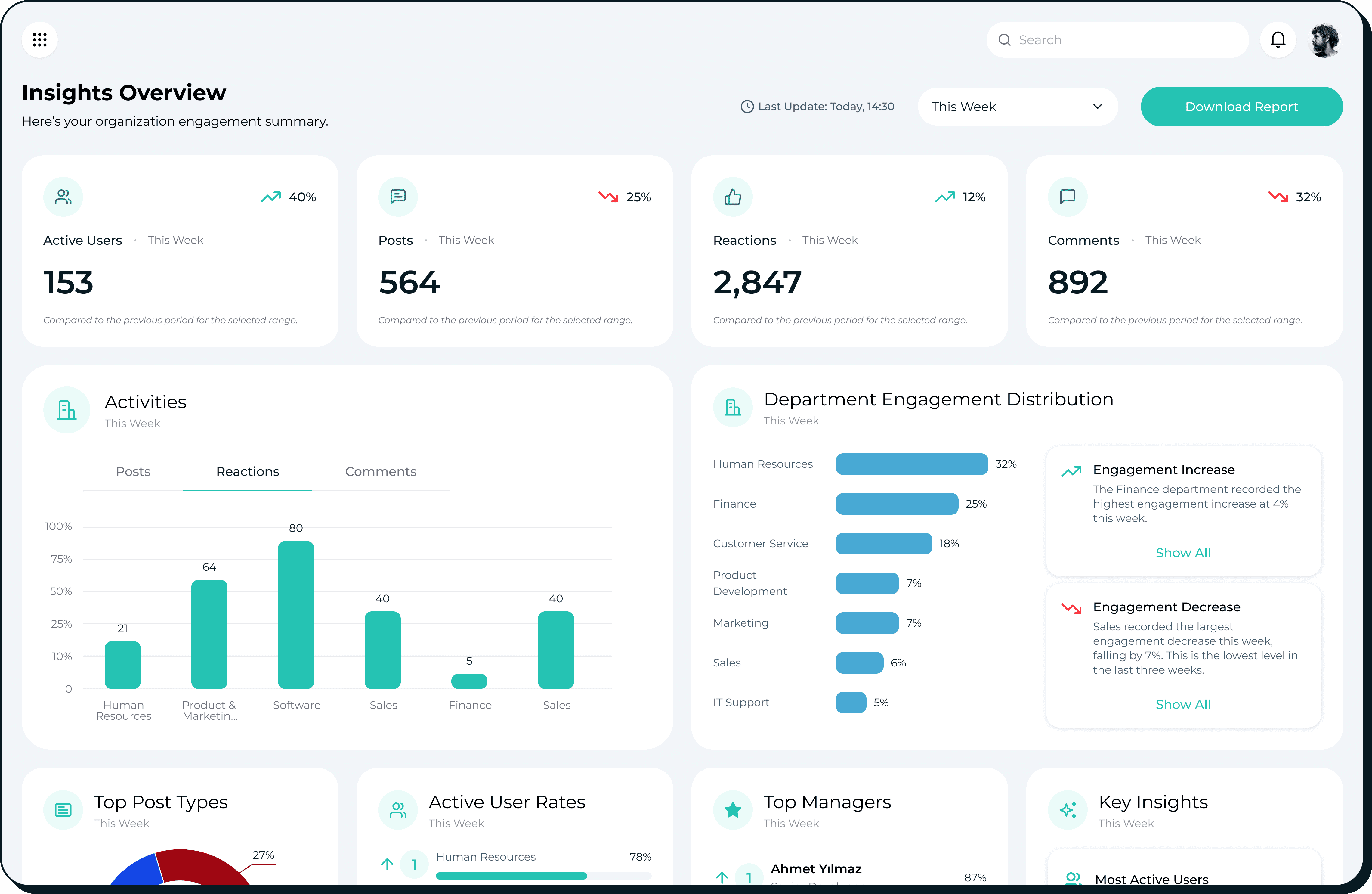 This part gives you a clear picture of how busy your organization really is. It gives a summary of the number of daily and weekly active users, the total number of interactions (like posts, reactions, and comments), and the overall trend in engagement over the past week. The goal is for leaders to quickly and easily understand things without being overwhelmed by complicated dashboards.