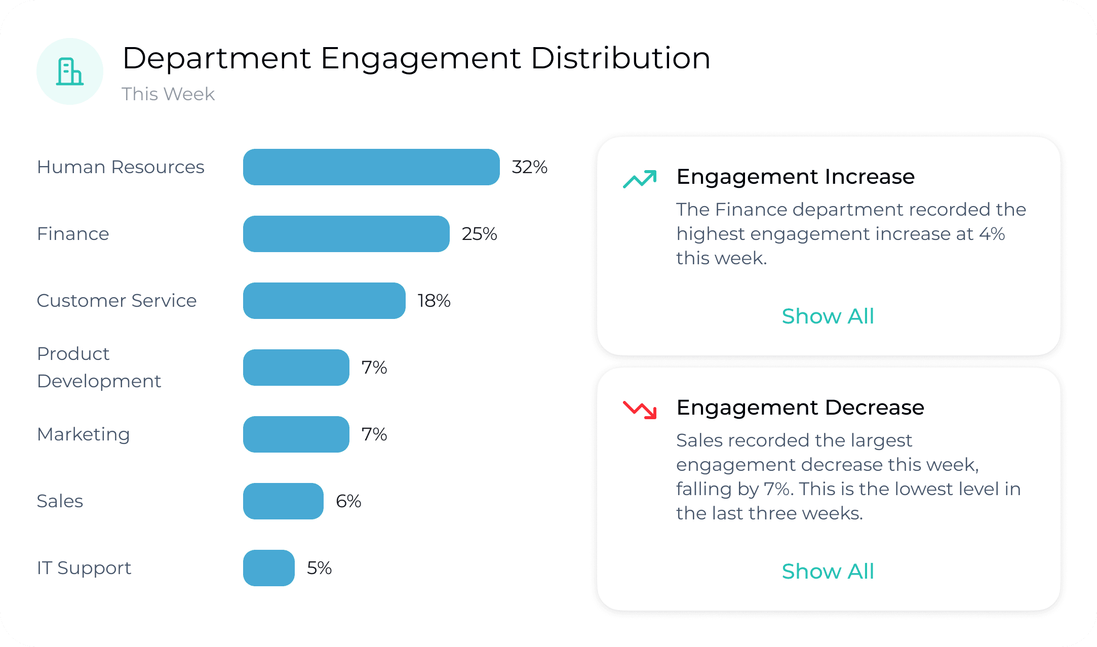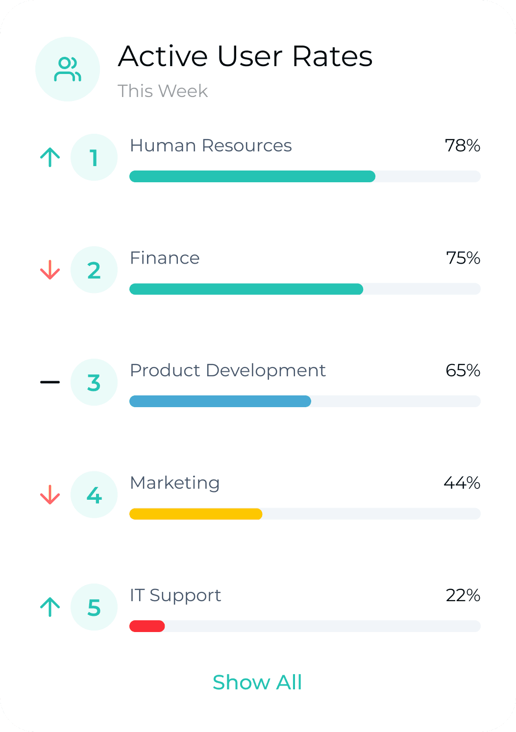 You can quickly see how engaged each department is with the heatmap. It shows the total number of interactions by department and the activity rates, which are the number of active users divided by the total number of users. This makes it easier to see changes in engagement early on, before other signs show that people are losing interest.