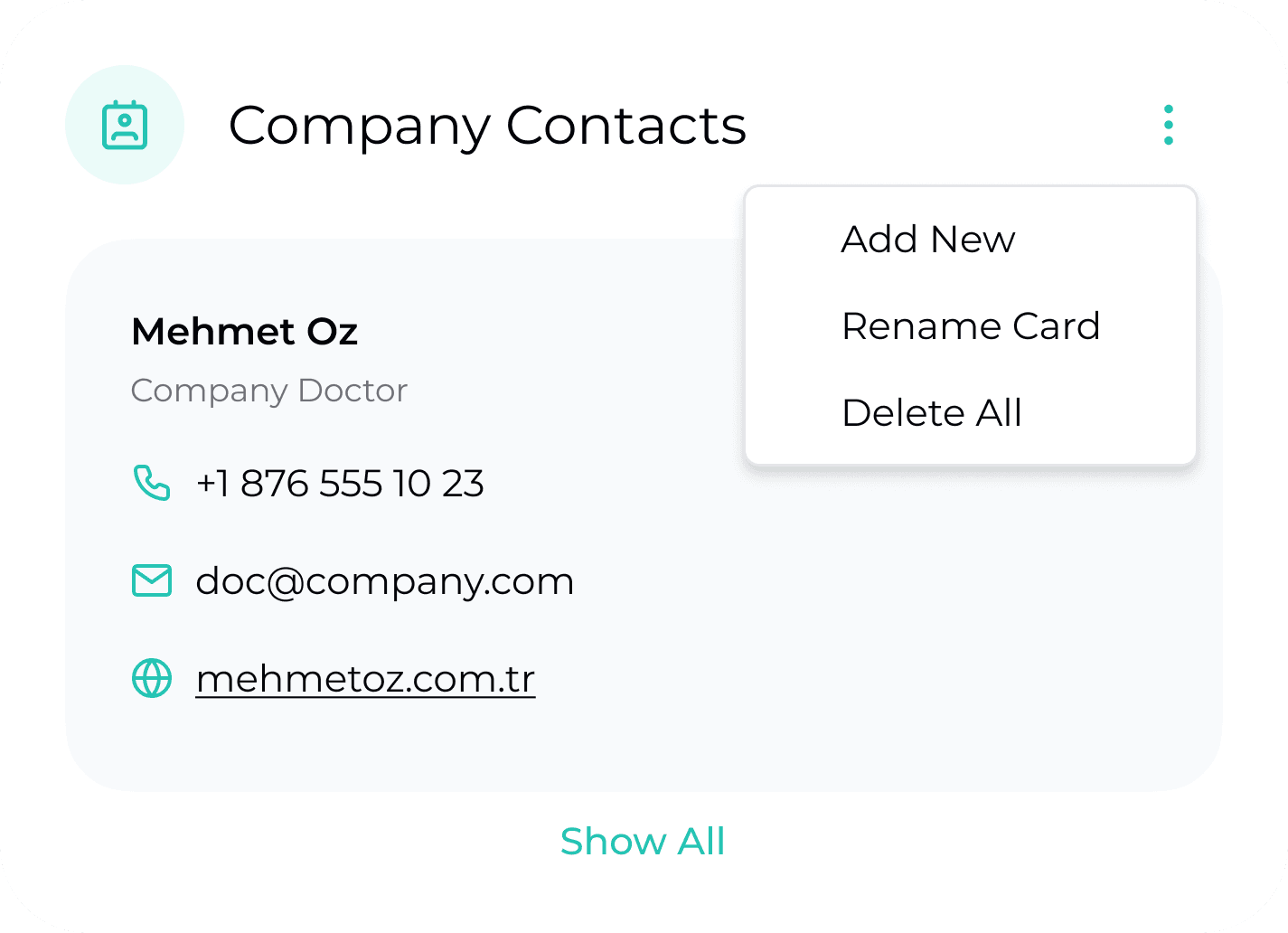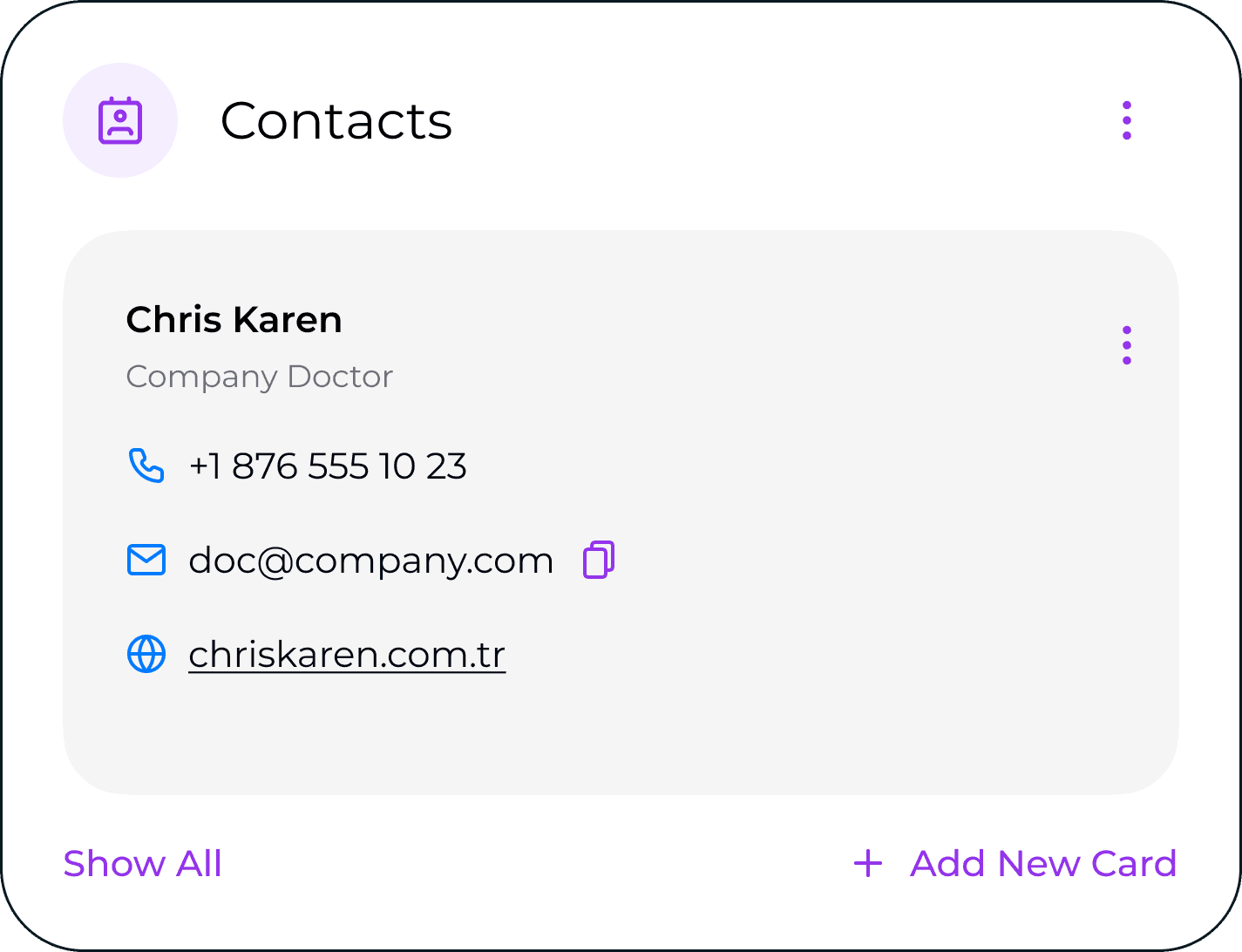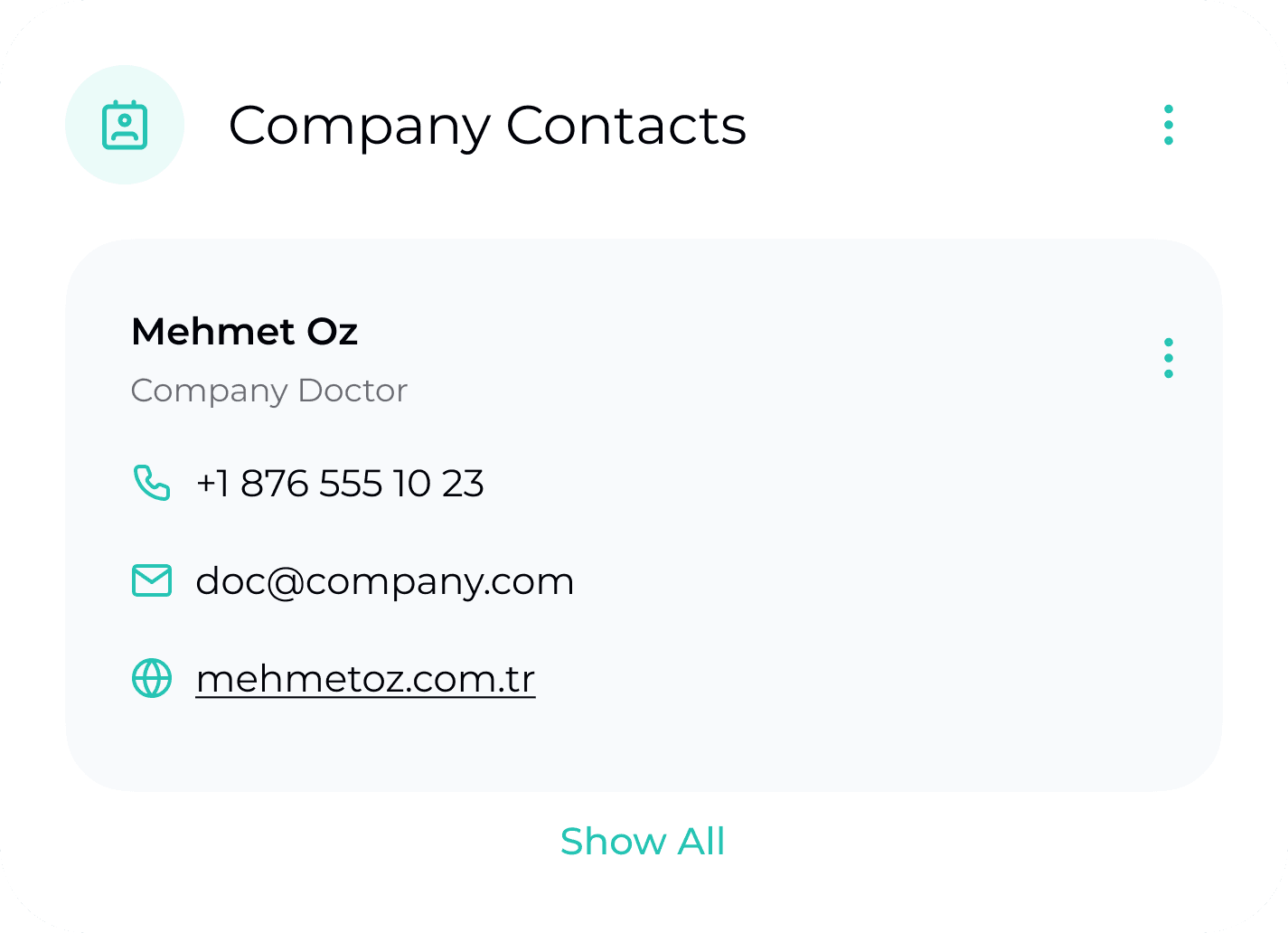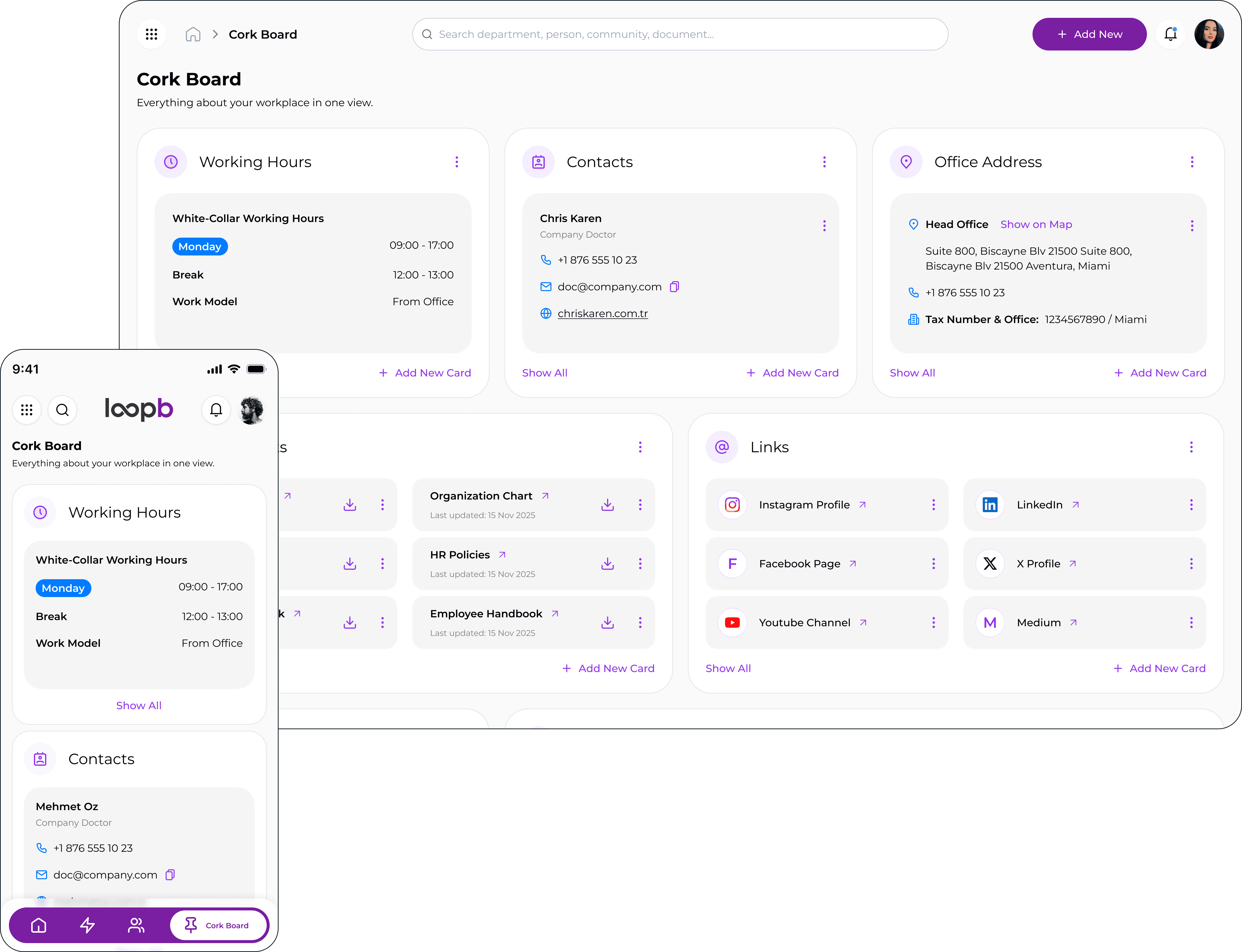 Cork Board organizes essential company information—such as working hours, contacts, office details, useful links, and documents—into clear categories, enabling employees to find answers in seconds without interrupting anyone.