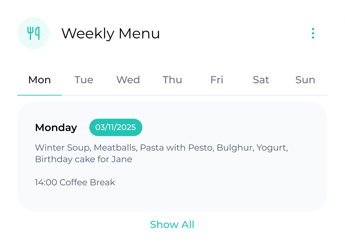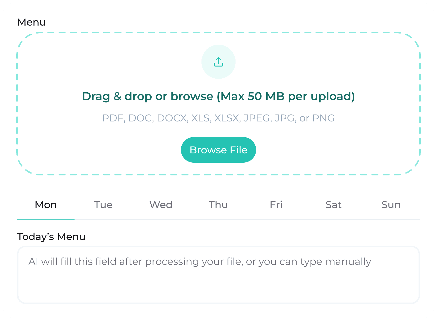 It doesn't have to take a long time to plan the weekly menu. HR and Admin teams can either type in the menu by hand or upload a file, like an image, Excel sheet, or document. AI can then pull out the information and suggest a weekly plan for approval. Employees never have to ask what's on the menu because they always know.