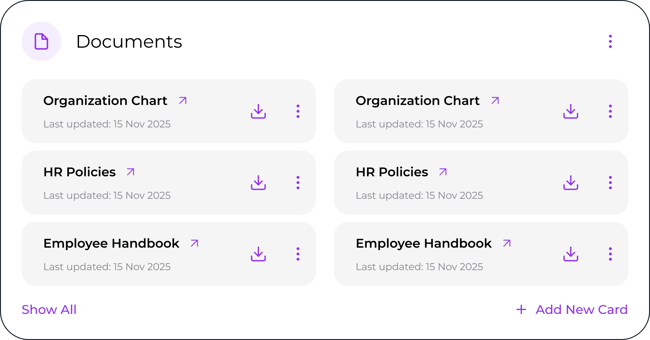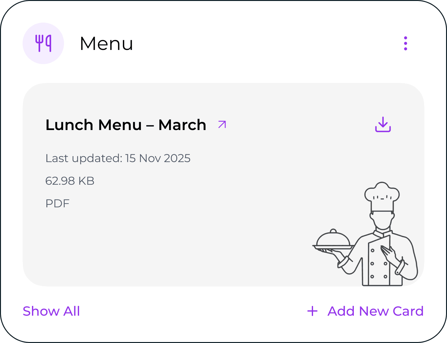 Planning and sharing the company menu doesn’t have to be complicated. HR and Admin teams can simply upload a file such as an image, Excel sheet, or document and display it in the widget they choose. Once added, the menu is always accessible to employees in one central place. No more questions, no more confusion, everyone knows what’s on the menu.